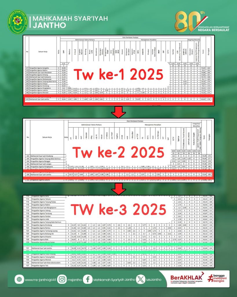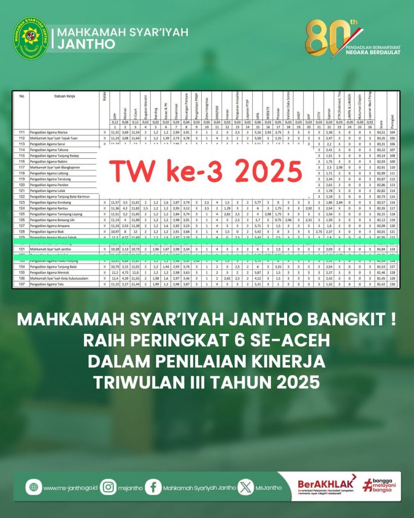 Kota Jantho (Selasa 21 Oktober 2025) — Kabar membanggakan datang dari keluarga besar Mahkamah Syar’iyah (MS) Jantho. Setelah sempat berada di posisi terbawah pada triwulan I dan II, kini MS Jantho berhasil bangkit dengan gemilang dan meraih peringkat ke-6 se-Wilayah Aceh serta peringkat ke-124 secara nasional dalam Penilaian Prestasi Kinerja Mahkamah Syar’iyah/Pengadilan Agama Kelas II Triwulan III Tahun 2025.