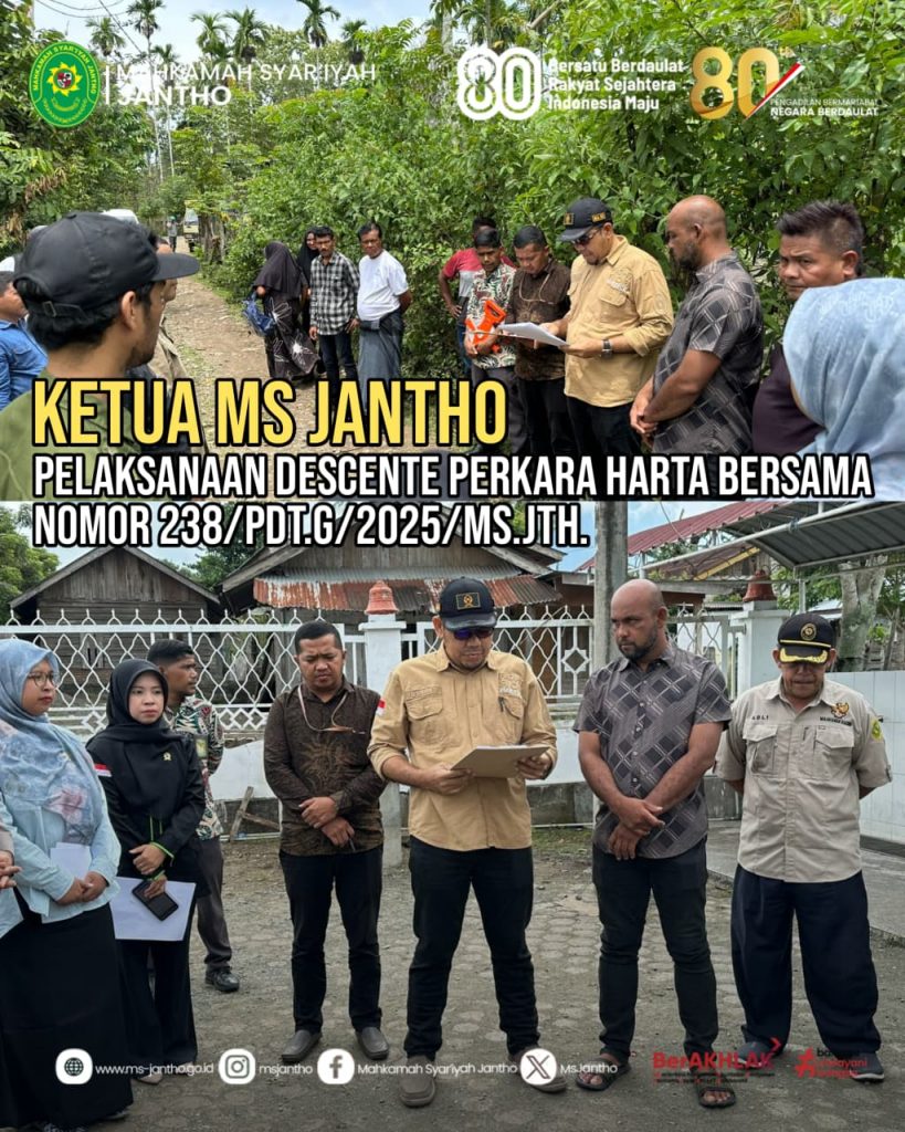 Bertempat di Dusun K. Hasbi Kemukiman Lamteuba dan Dusun Blang Anoe Kemukiman Lamteuba Kecamatan Seulimum Kabupaten Aceh Besar, pelaksanaan Descente dipimpin oleh Ketua Mahkamah Syar’iyah Jantho/Ketua Majelis Hakim Bapak Yusnard S.H.I., M.H. bersama Ibu Nurul Husna, S.H., M.H. dan Ibu Nurlaili Maghfirah, S.H., didampingi oleh Panitera Bapak Akmal Hakim BS S.H.I., M.H. dan Jurusita Bapak Adli serta Aparatur lainnya.