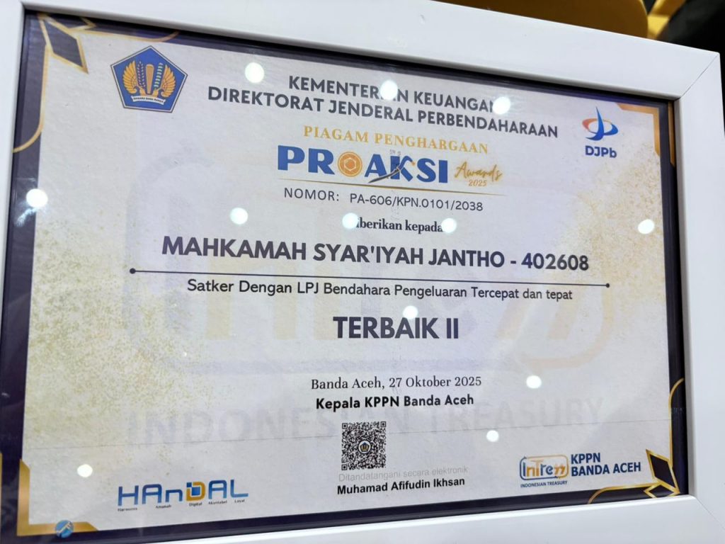 Kota Jantho, Selasa (28 Oktober 2025) – Momen peringatan Hari Sumpah Pemuda ke-97, 28 Oktober 2025, menjadi lebih bermakna bagi keluarga besar Mahkamah Syar’iyah Jantho. Di hari yang penuh semangat perjuangan generasi muda tersebut, Mahkamah Syar’iyah Jantho berhasil meraih Piagam Penghargaan Pro Aksi Award 2025 sebagai Terbaik II Satker dengan LPJ Bendahara Pengeluaran Tercepat dan Tepat.