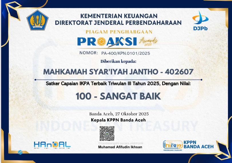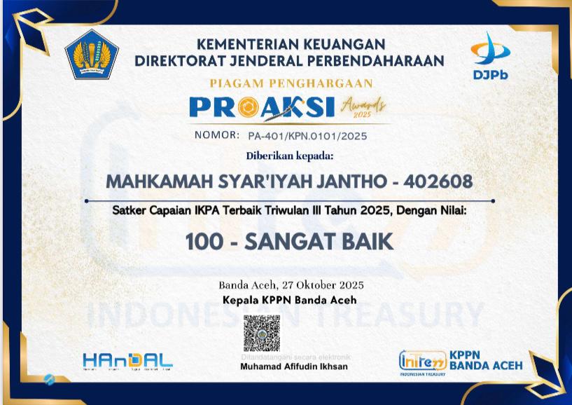 Kota Jantho, Kamis (30 Oktober 2025) – Dua DIPA yang dikelola oleh Mahkamah Syar’iyah Jantho, yaitu DIPA 01 (Badan Urusan Administrasi) dan DIPA 04 (Direktorat Jenderal Badan Peradilan Agama), berhasil meraih Predikat Satuan Kerja (Satker) Capaian Indikator Kinerja Pelaksanaan Anggaran (IKPA) Terbaik Triwulan III Tahun 2025 dengan nilai sempurna, 100 (Sangat Baik).