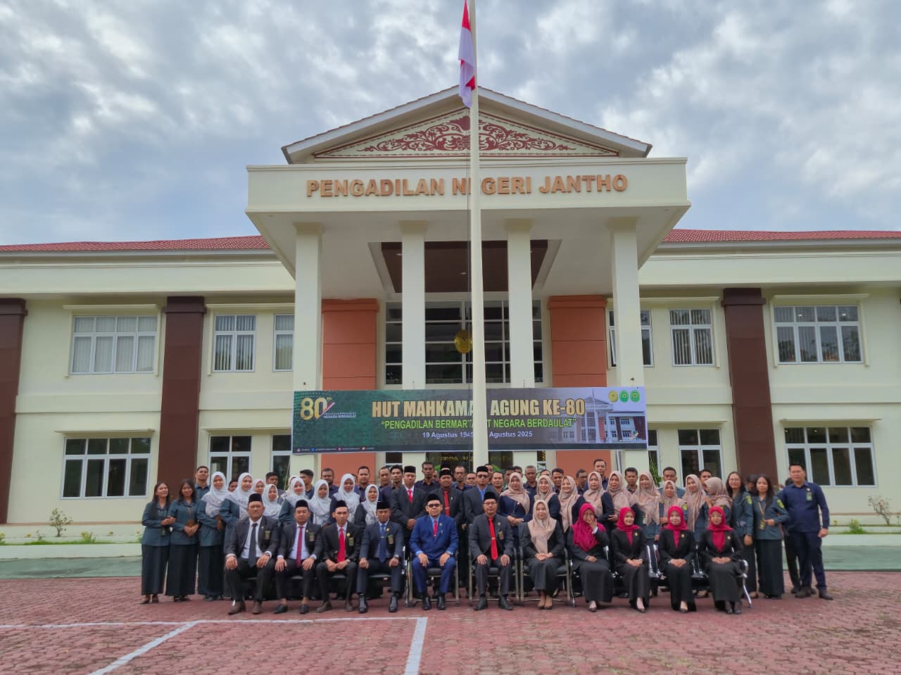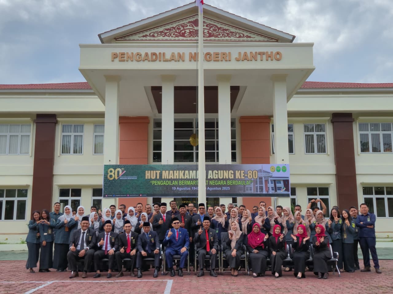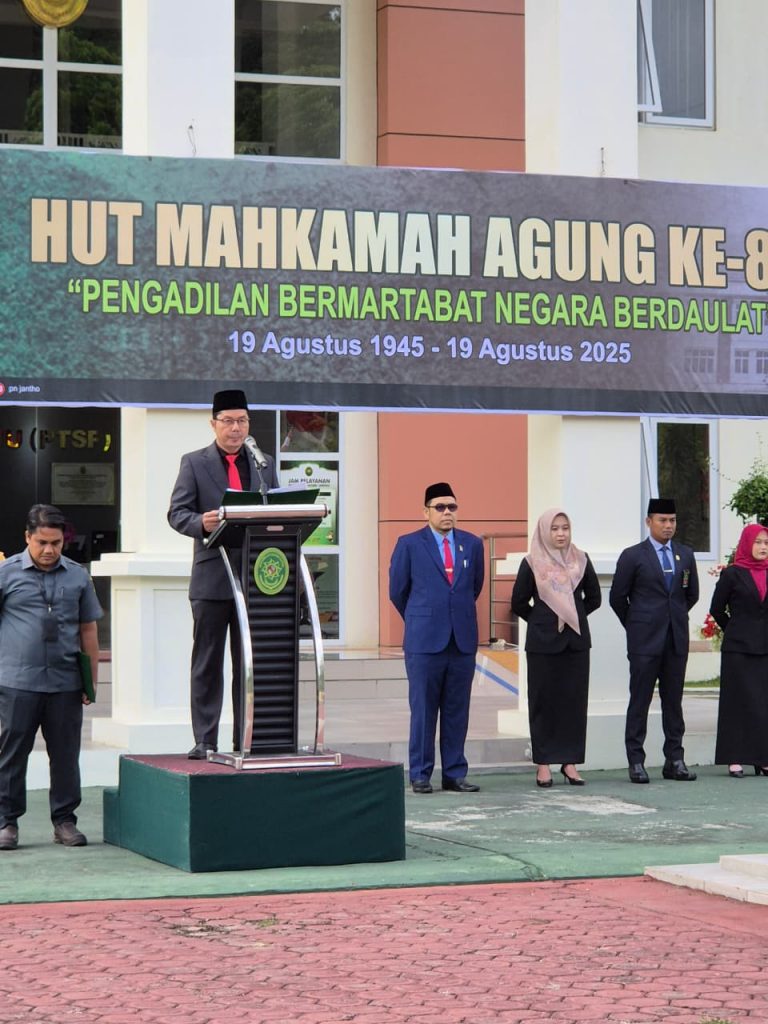 Kota Jantho. 19 Agustus 2025. Dalam rangka memperingati HUT Mahkamah Agung RI ke-80, Mahkamah Syar’iyah Jantho dan Pengadilan Negeri Jantho gelar upacara bersama di halaman Kantor Pengadilan Negeri Jantho pada selasa, 19 Agustus 2025. Pelaksanaan upacara berlangsung penuh khidmat yang diikuti oleh seluruh aparatur Mahkamah Syar’iyah Jantho dan Pengadilan Negeri Jantho.