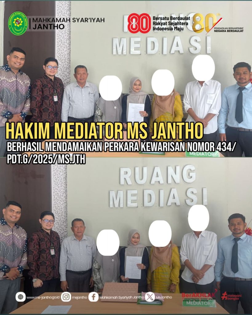 Kota Jantho, 8 Oktober 2025 — Perkara Gugatan Waris Nomor 434/Pdt.G/2025/MS.Jth yang sempat bersitegang di Mahkamah Syar’iyah Jantho akhirnya berakhir dengan damai. Melalui proses mediasi yang dipimpin oleh Hakim Mediator, para pihak yang berselisih berhasil mencapai kesepakatan tanpa perlu melanjutkan ketahap persidangan.